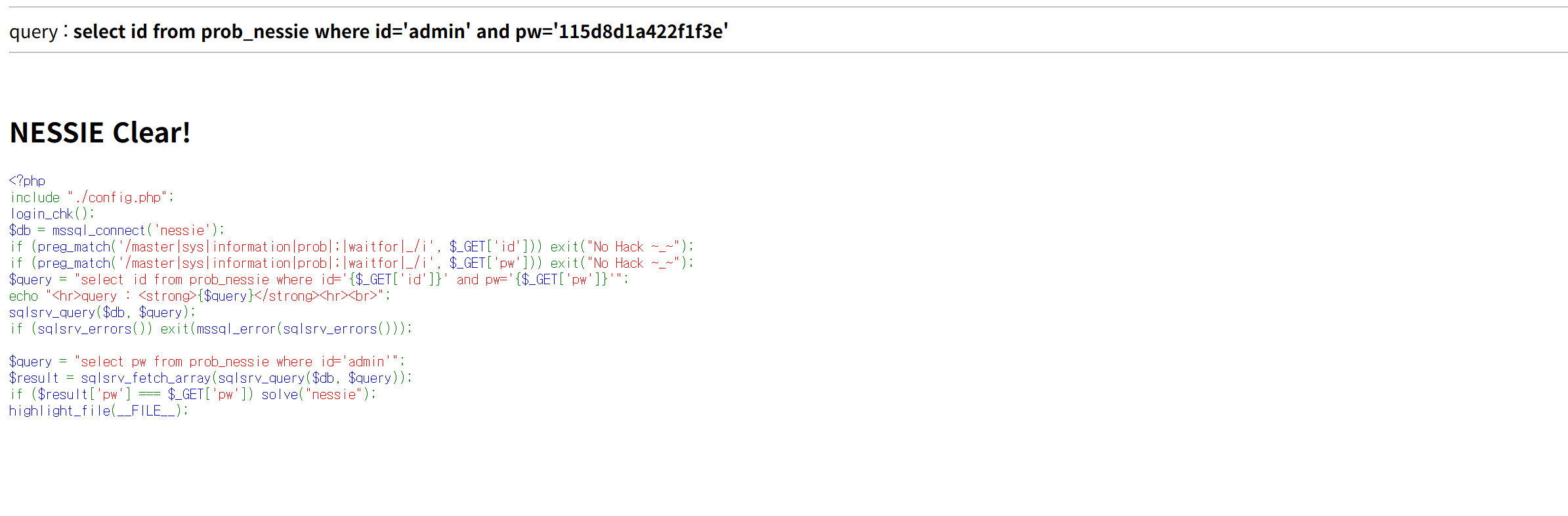 if (preg_match('/master|sys|information|prob|;|waitfor|_/i', $_GET['pw'])) exit("No Hack ~_~");