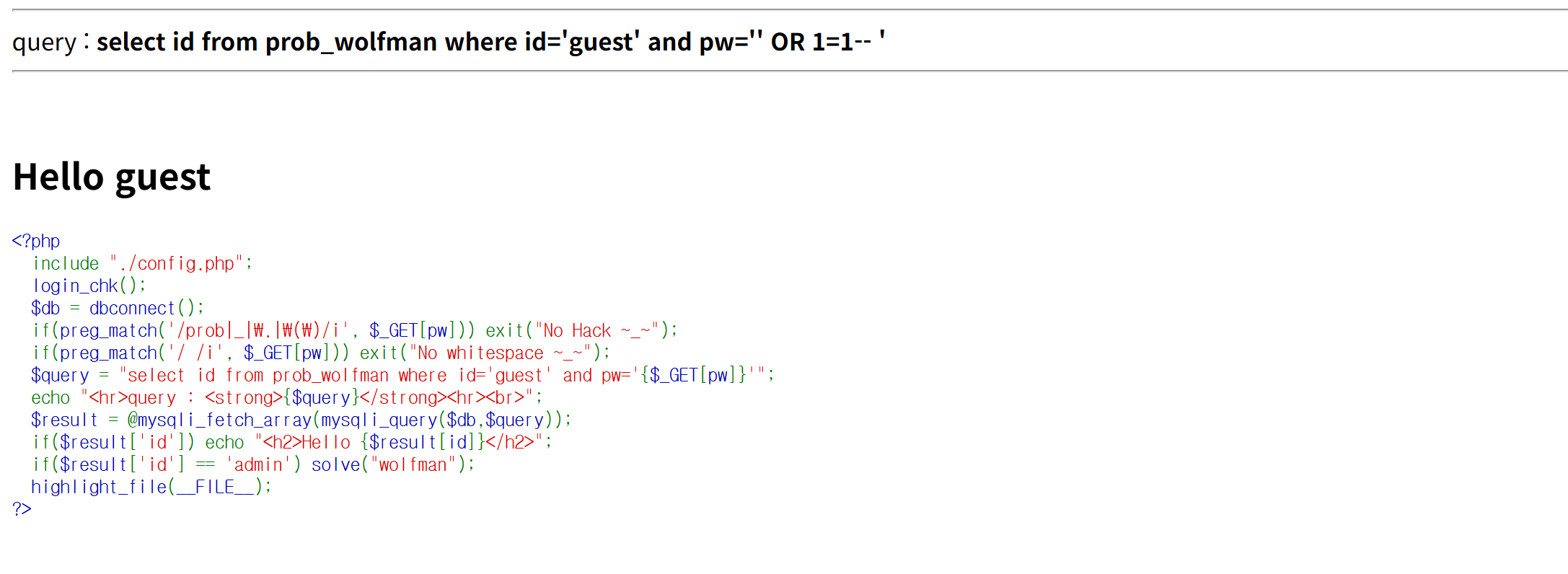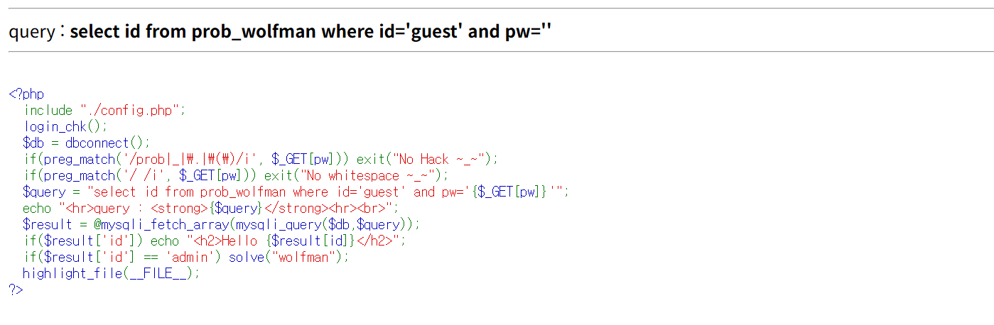 preg_match('/ /i', $_GET[pw) 에 의해 공백 문자가 필터링 되고 있다.