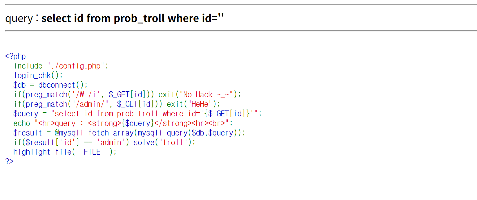 preg_match(...) 함수를 통해 홑따옴표(‘)와 “admin” 문자열 사용이 불가하도록 입력 값 필터링을 하고 있습니다.