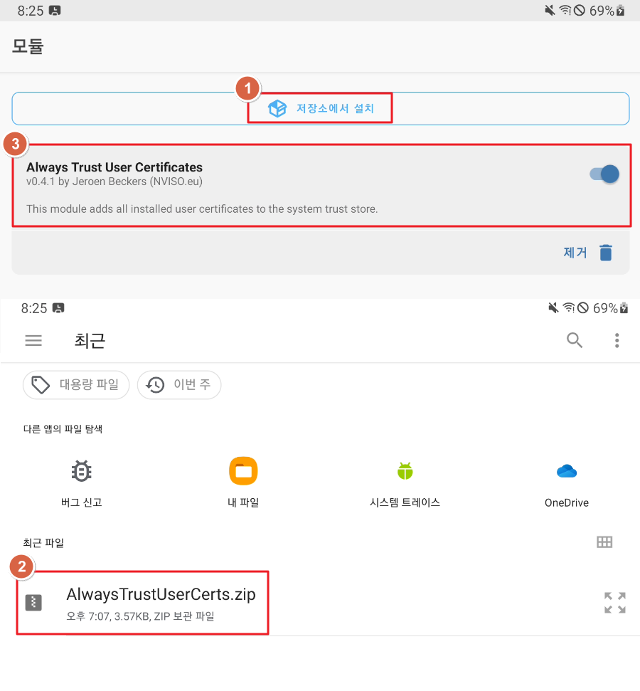 (2) 매지스크 → 모듈 → 저장소에 설치 → AlwaysTrustUserCerts.zip 선택