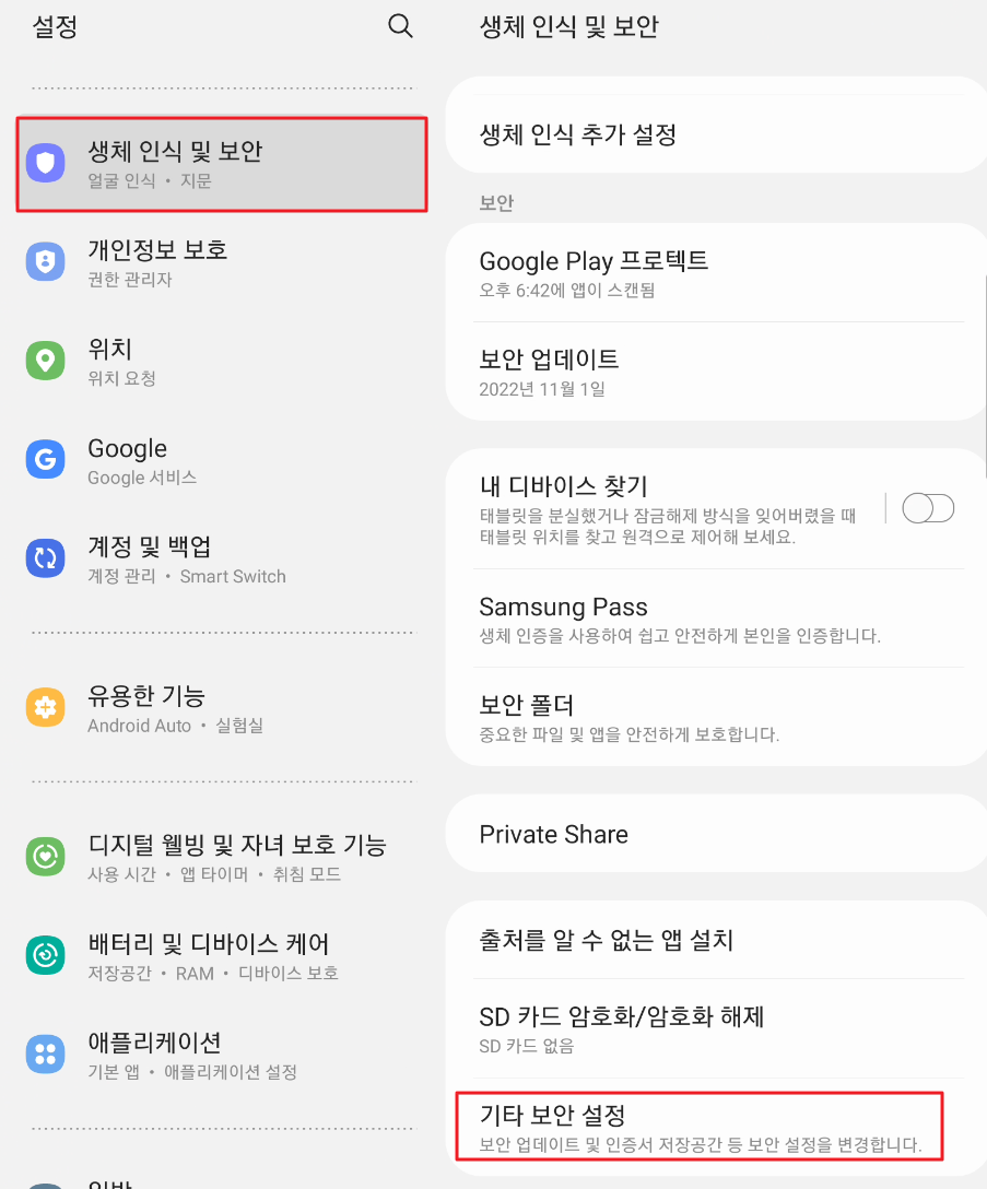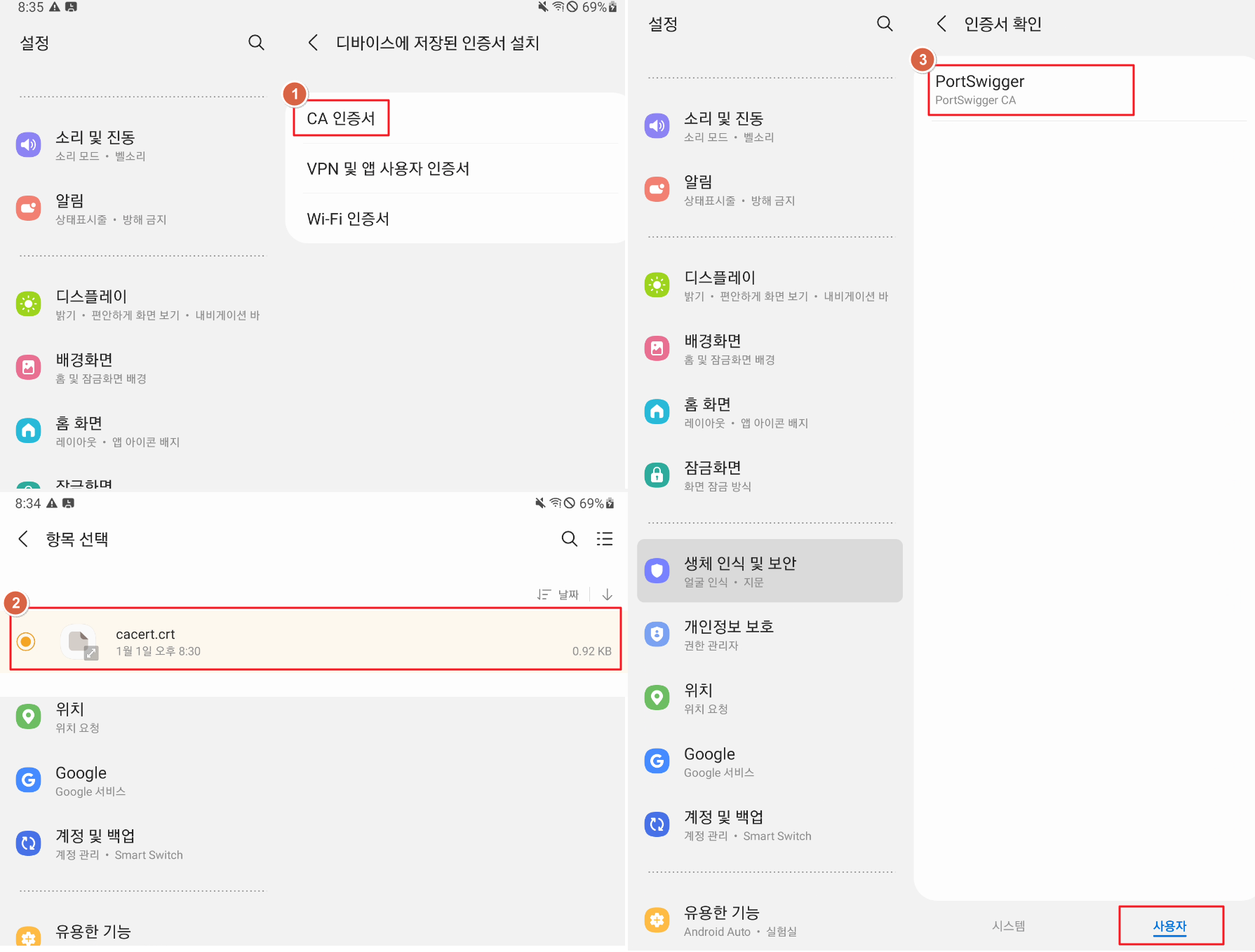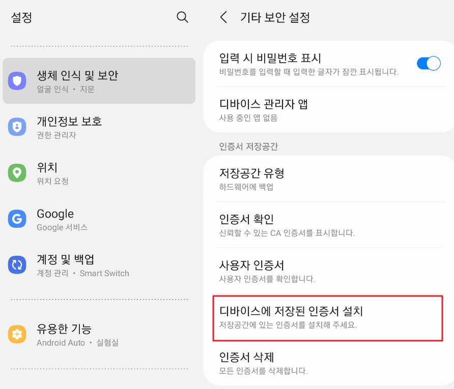 (4) 단말기를 재부팅하면 설치한 사용자 인증서를 시스템 인증서 경로에서도 확인할 수 있습니다.
