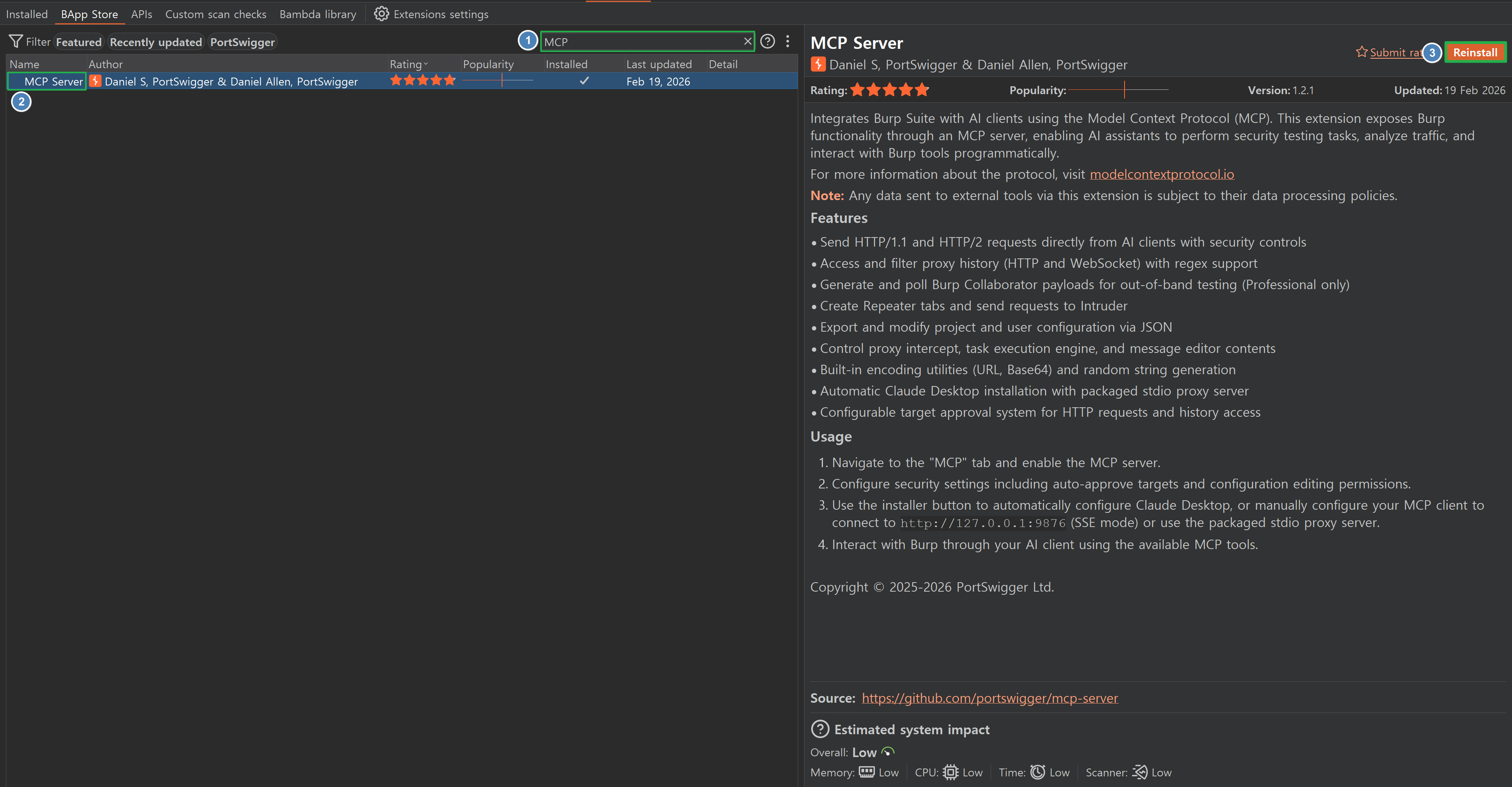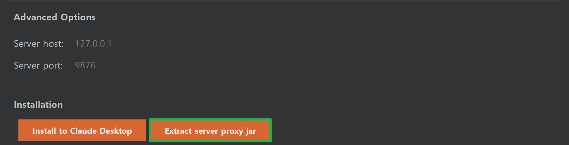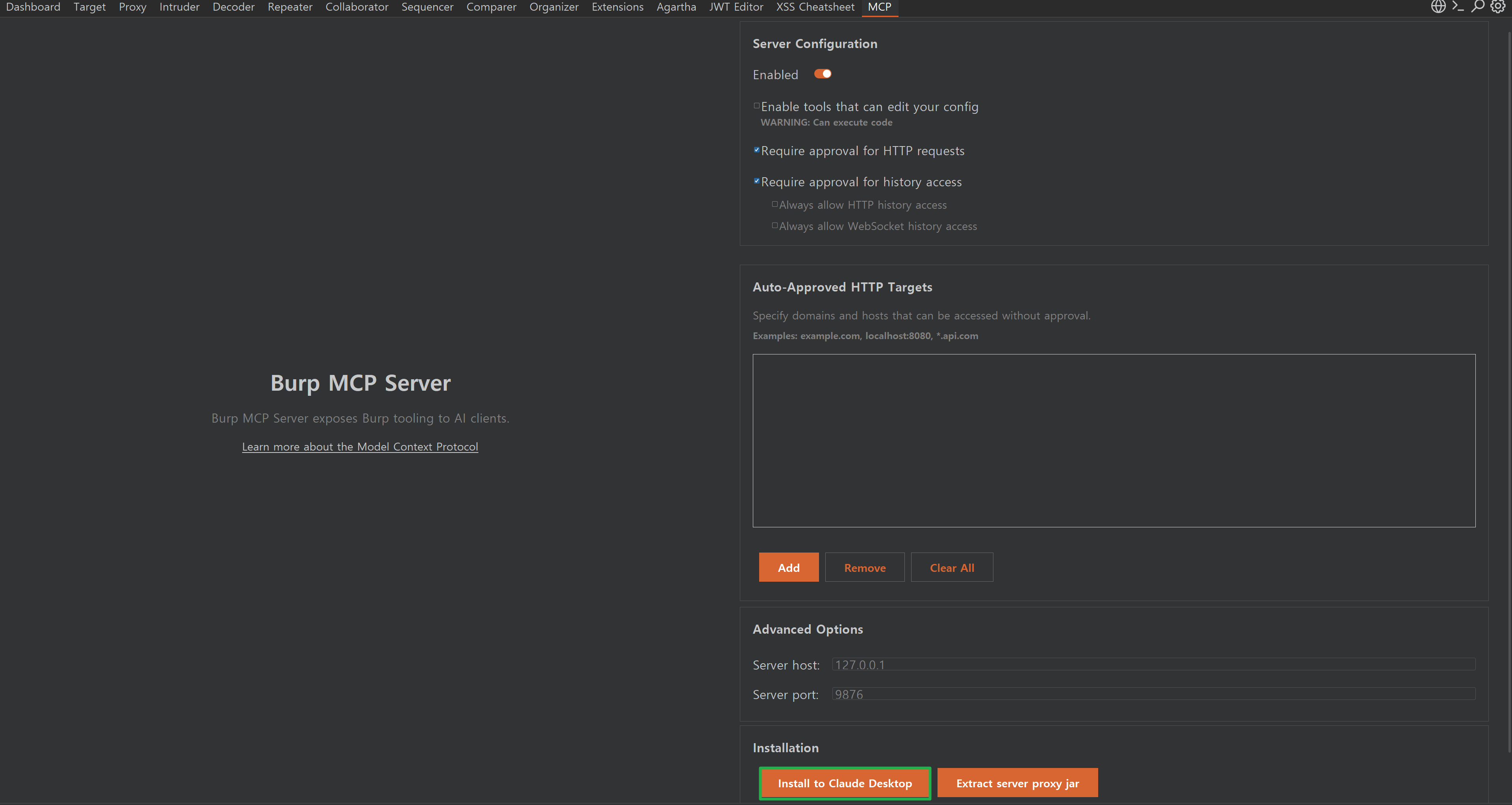 }mcp-proxy-all.jar 파일은 버프스위트의 MCP 익스텐션에서 하단의 “Extract server proxy jar” 버튼을 눌러 추출하면 됩니다.
