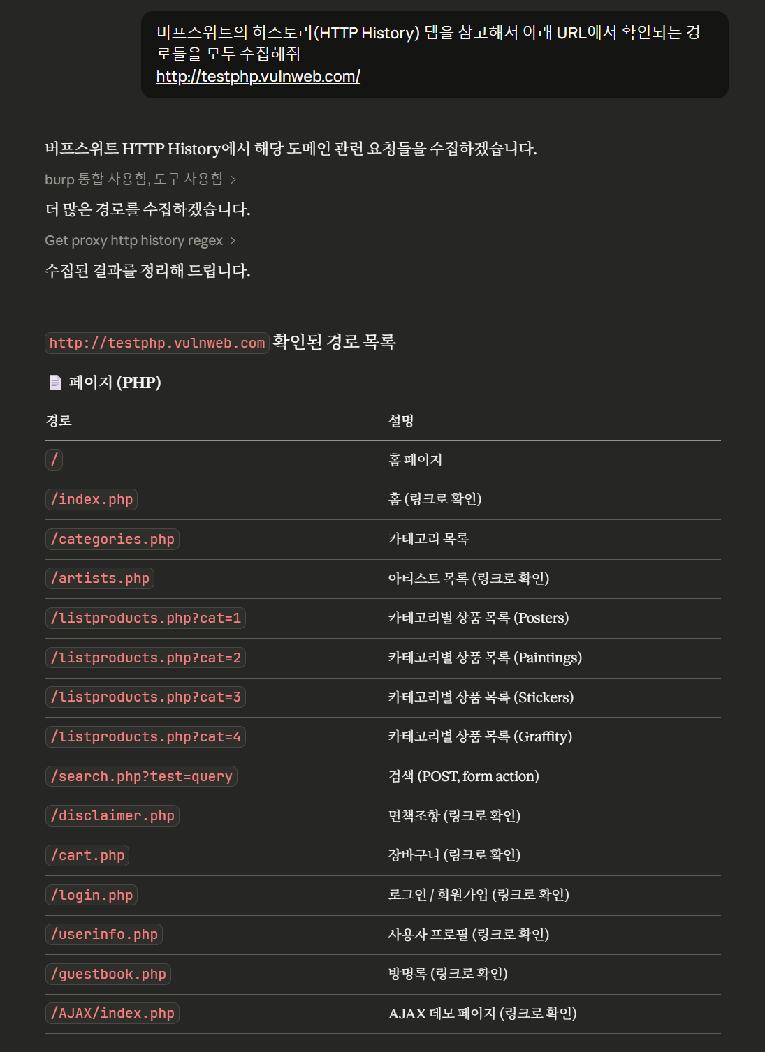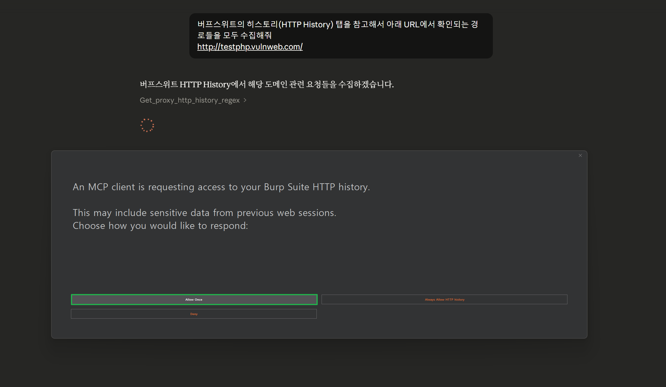 “Allow Once / Always Allow HTTP History” 버튼을 누른 후 조금 기다리면 MCP가 분석한 내용을 정리해서 반환해줍니다.