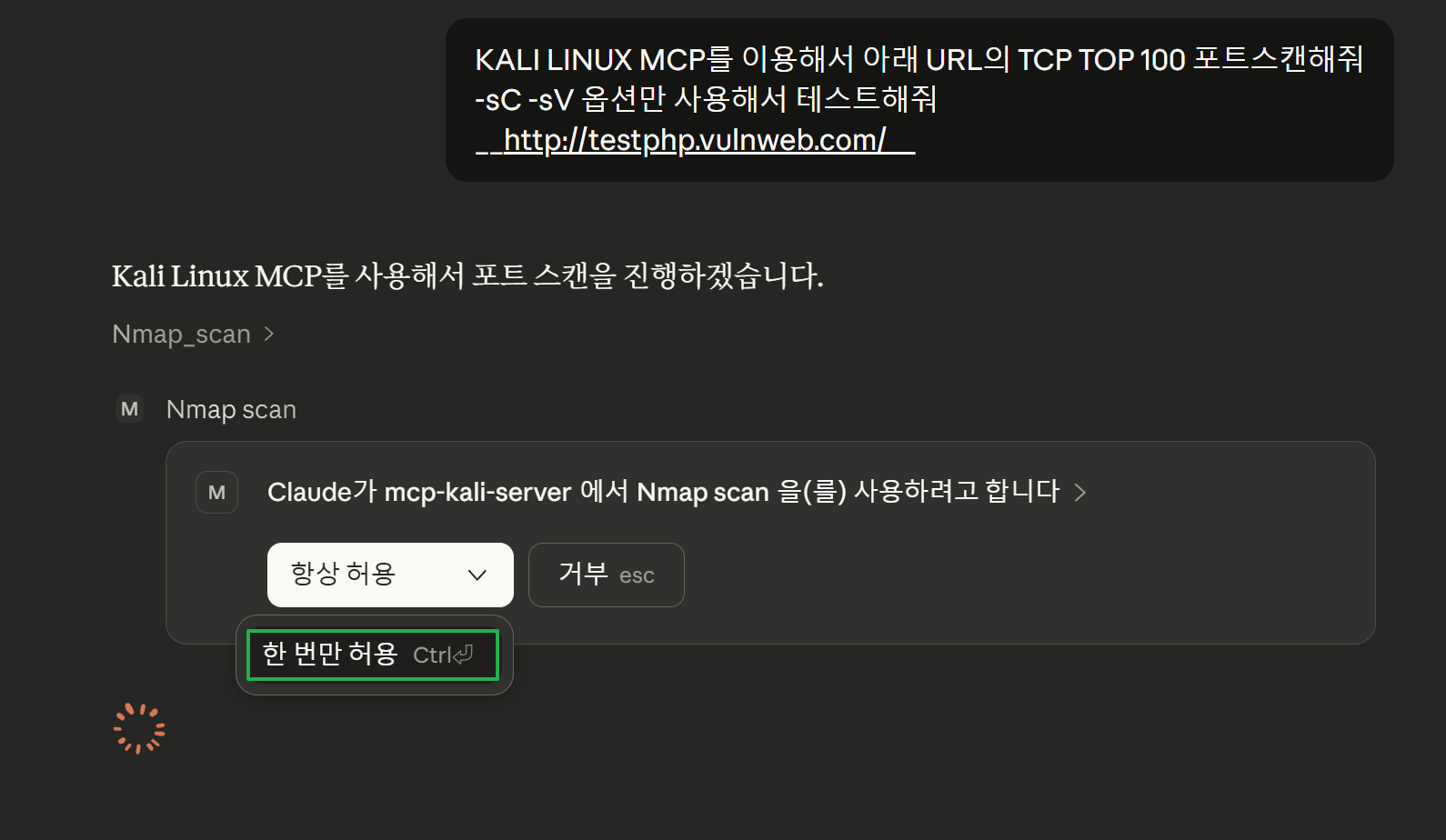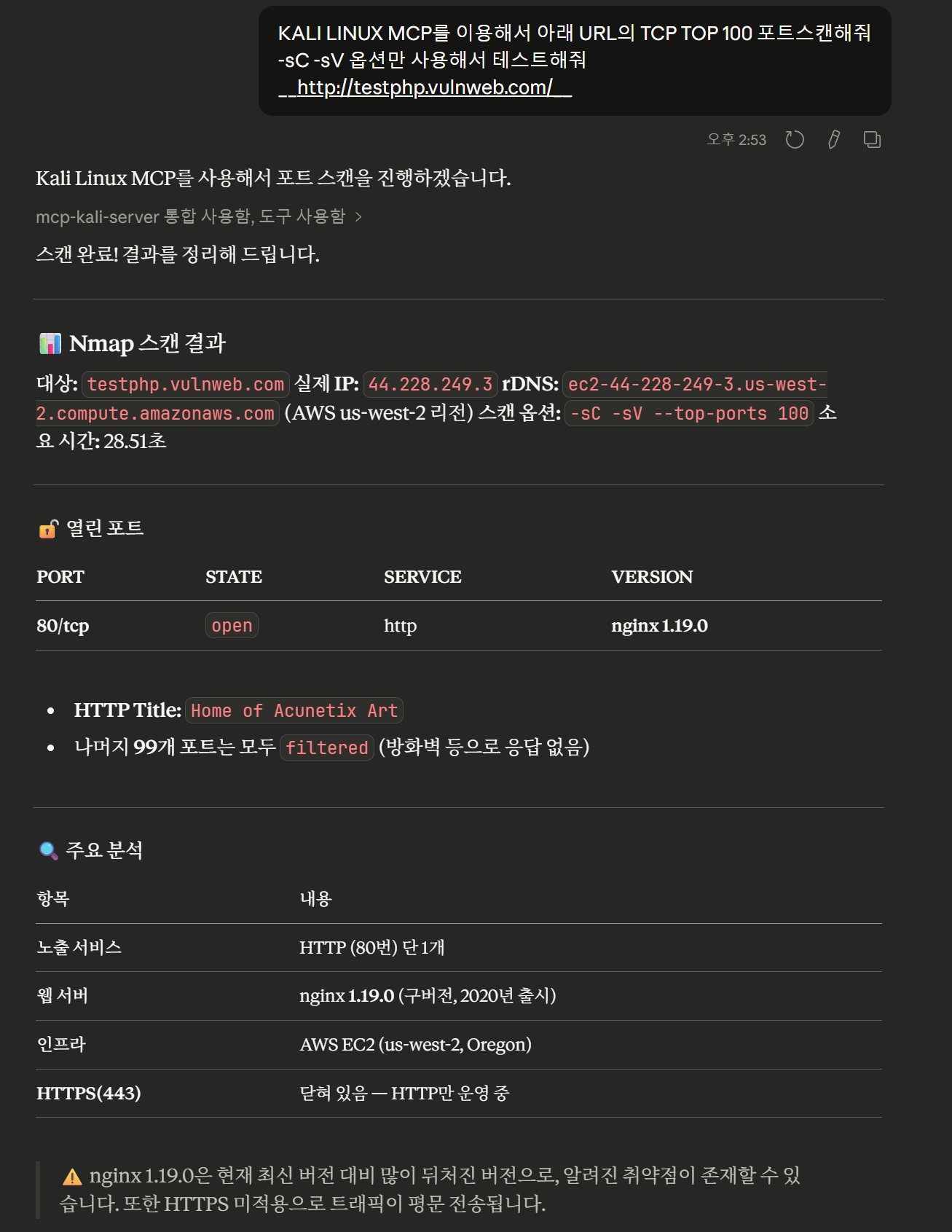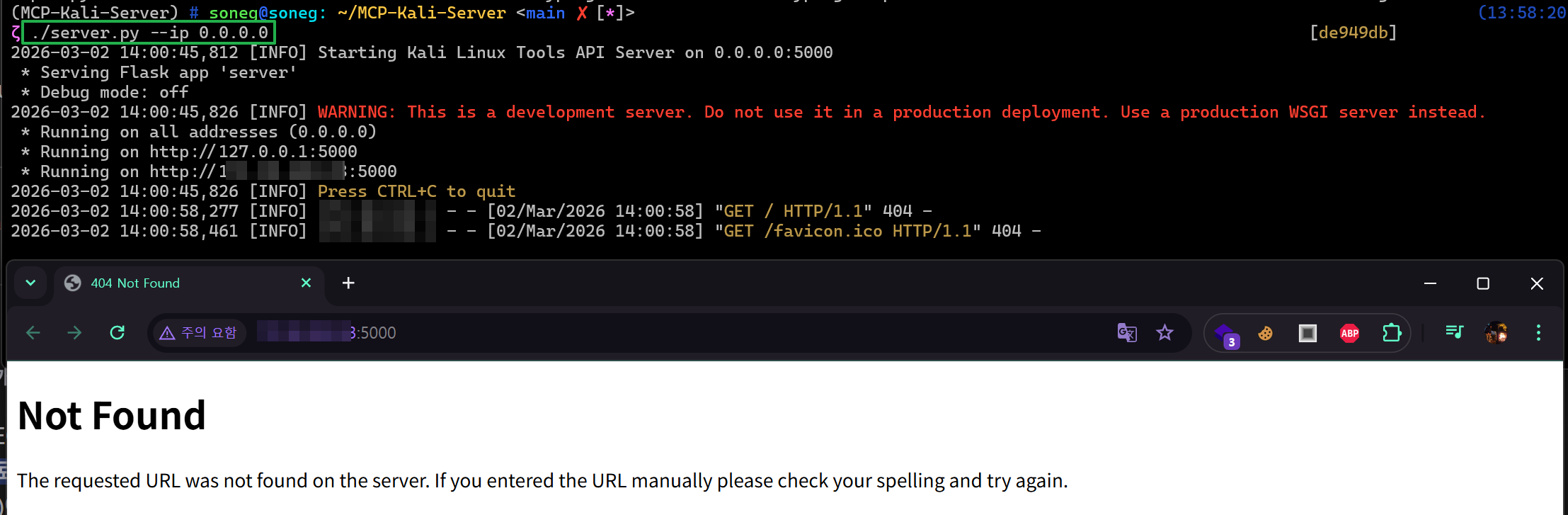 - 칼리리눅스 MCP 서버의 포트는 따로 설정하지 않으면 5000번 포트가 기본적으로 사용됩니다.