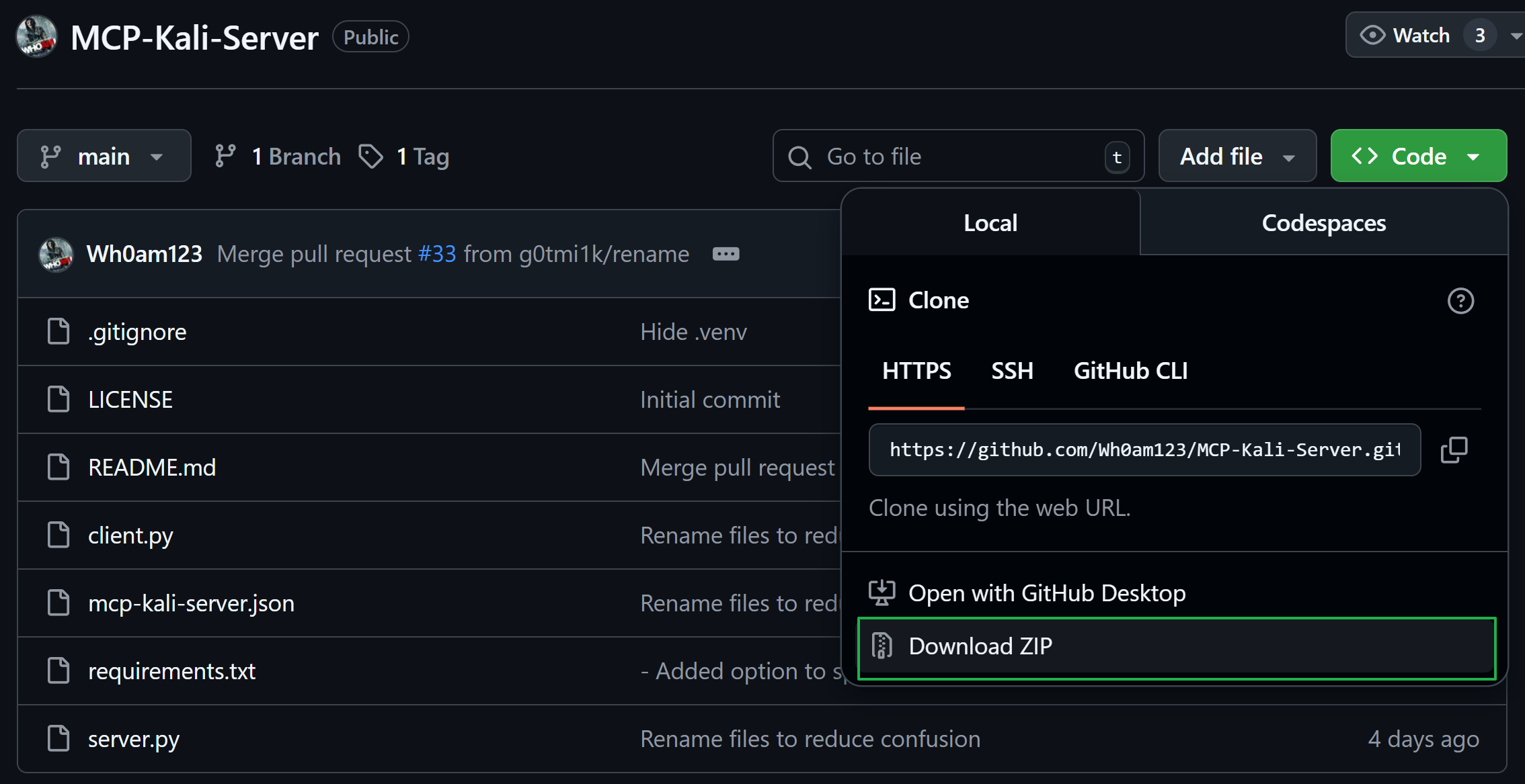 - MCP-Kali-Server 깃허브에서 ZIP 파일을 다운로드 해줍니다.