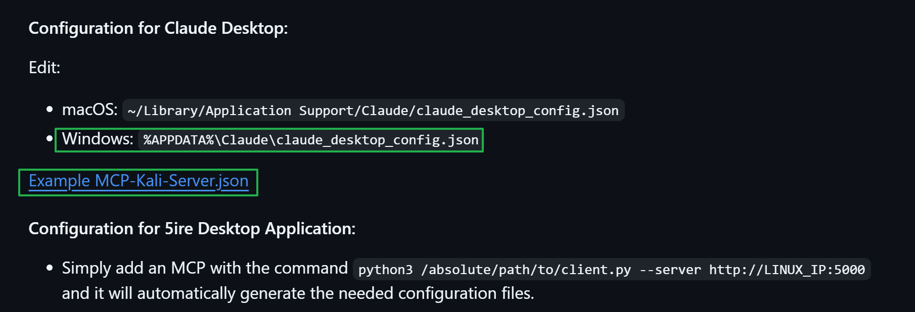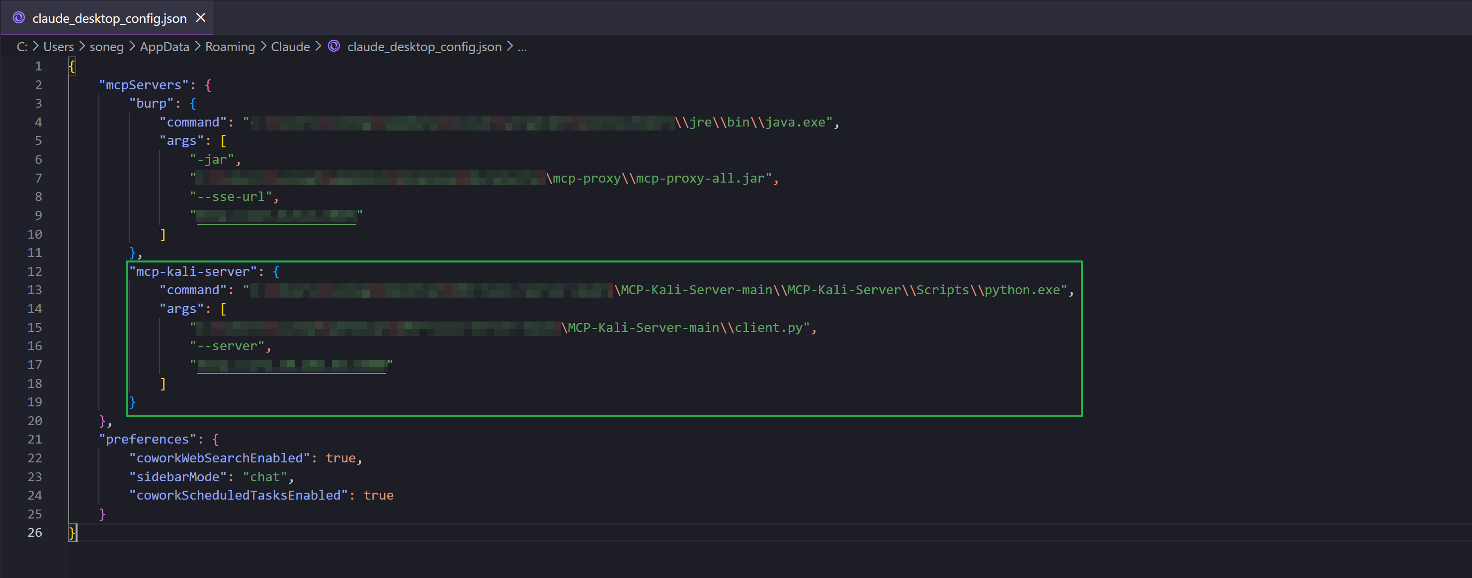 칼리리눅스 MCP 사용을 위한 클로드 데스크톱 설정파일 양식은 아래와 같습니다.