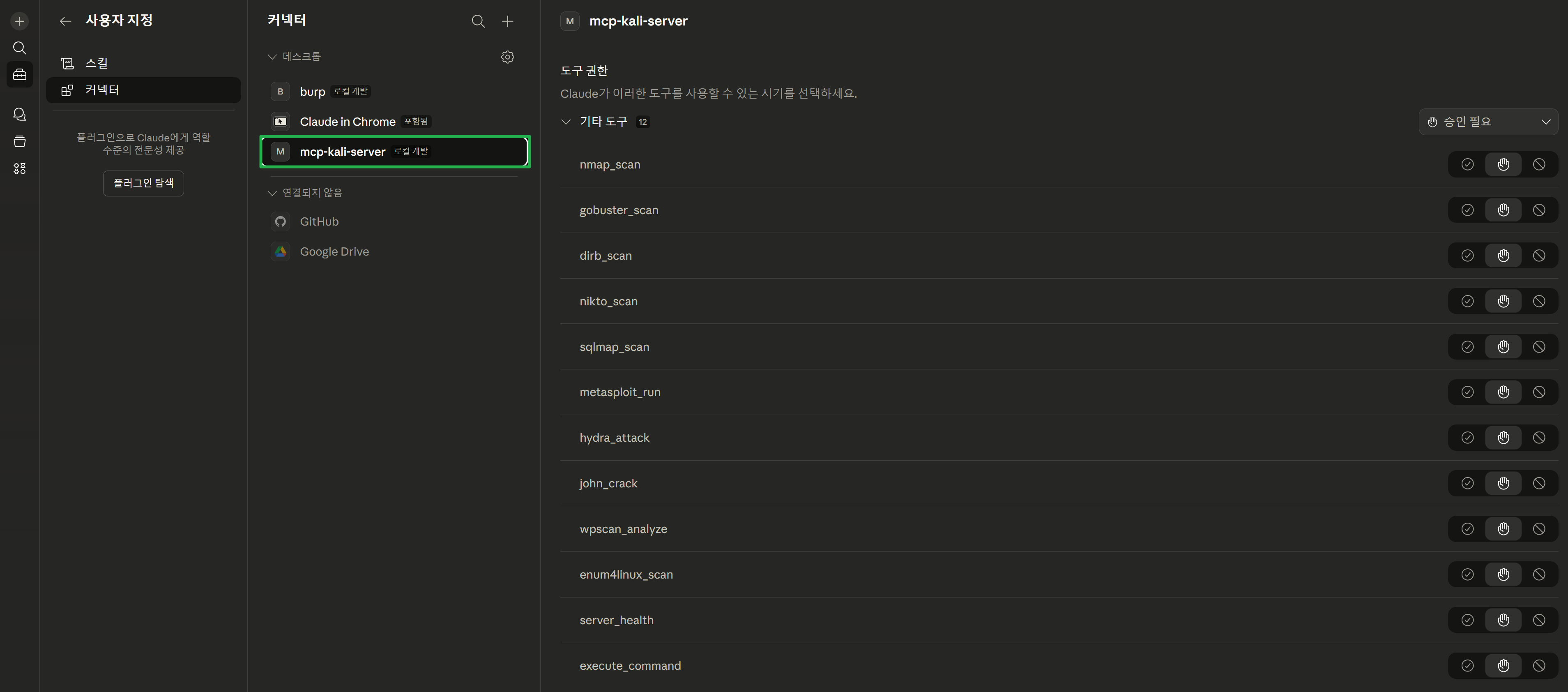 현재 칼리리눅스 MCP 서버에서는 NMAP, GOBUSTER, DIRB, NIKTO, SQLMAP, METASPLOIT, ETC 등의 기능을 제공해주고 있습니다.