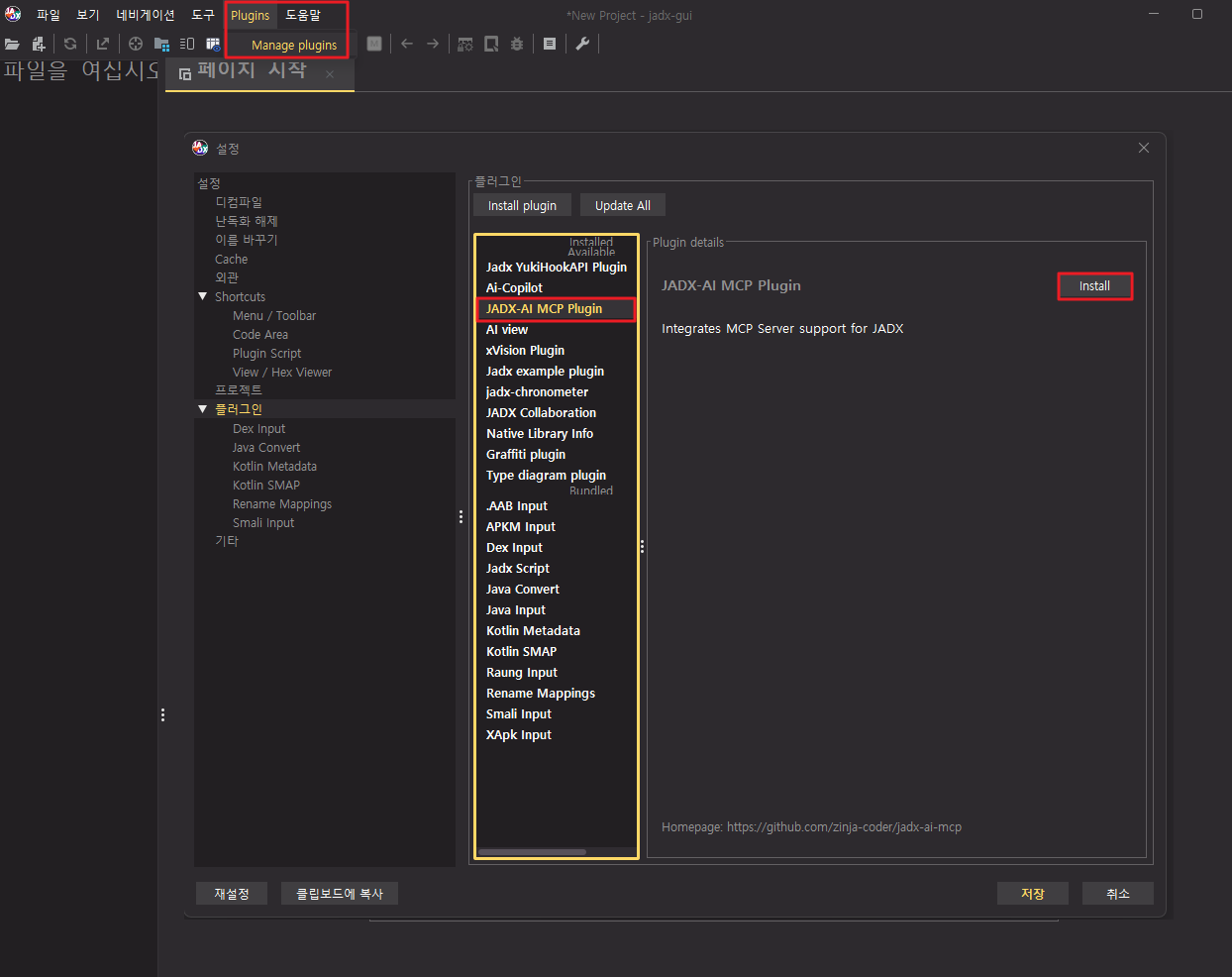 - (Plugins > Manage plugins > 플러그인 > JADX-AI MCP Plugin > Install)