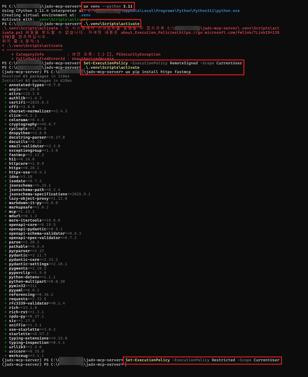 uv venv --python 3.11명령어 실행 (의존성 충돌 예방을 위해 가상환경에서 사용하기 위함) - [3] 위 명령어 실행 시 오류(about_Execution_Policies) 발생하는 경우 아래 명령어 실행