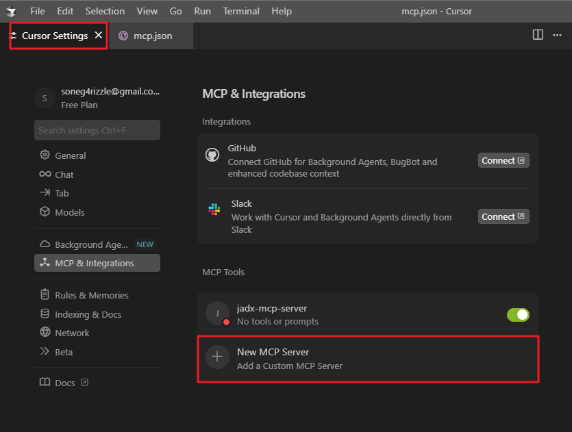 Cursor Settings화면으로 돌아와MCP Tools탭에 있는jadx-mcp-server활성화