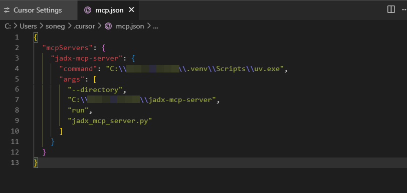 jadx, jadx-mcp-server, Cursor를 각각 다운로드 한다.- [1] jadx 1.5.3