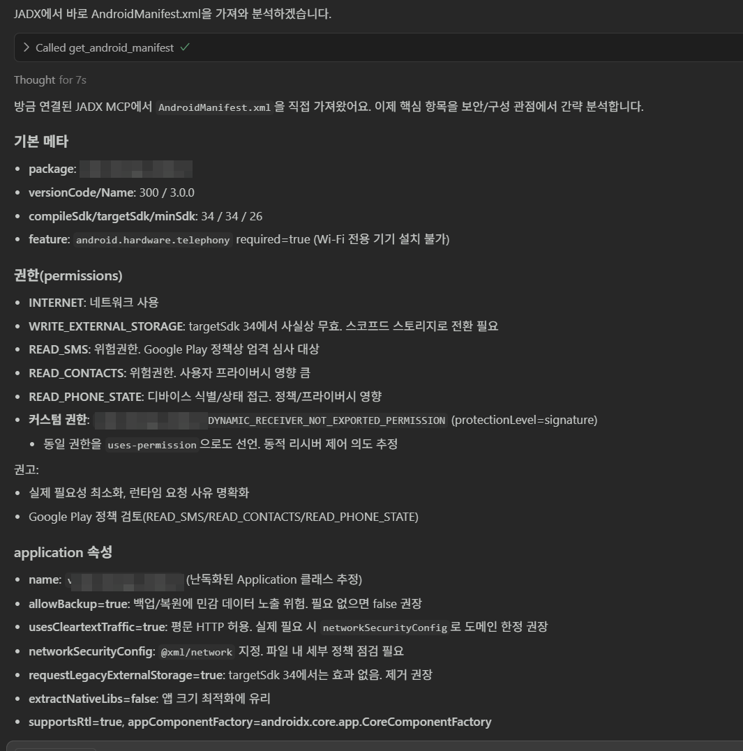 - 만약 질문에 대한 대답을 정상적으로 하지 못하고 있다면, 재부팅 후 다시 진행하거나 “JADX에서 분석해줘~“로 얘기하면 잘 알아듣는다.