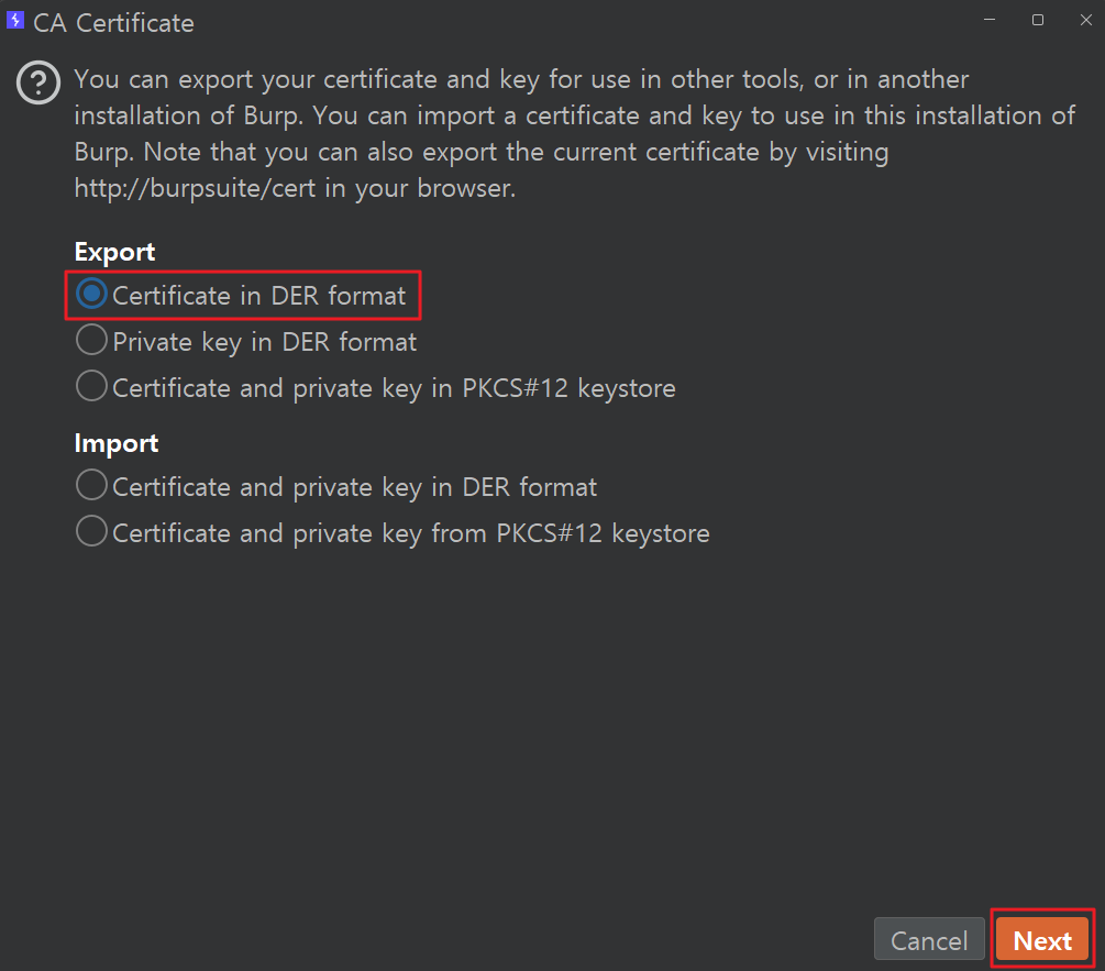 # Proxy > Proxy Settings > Import / export CA certificate > Certificate and private key in PKCS12 format 선택